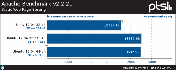 32 vs 64 bits en un Core 2 Duo. Fuente: Phoronix.Tal y como vemos en el banco de pruebas realizado por Phoronix, Apache compilado para 32 bits obtiene un resultado ligeramente superior. En otros artículos se puede comprobar que esta afirmación se mantiene.