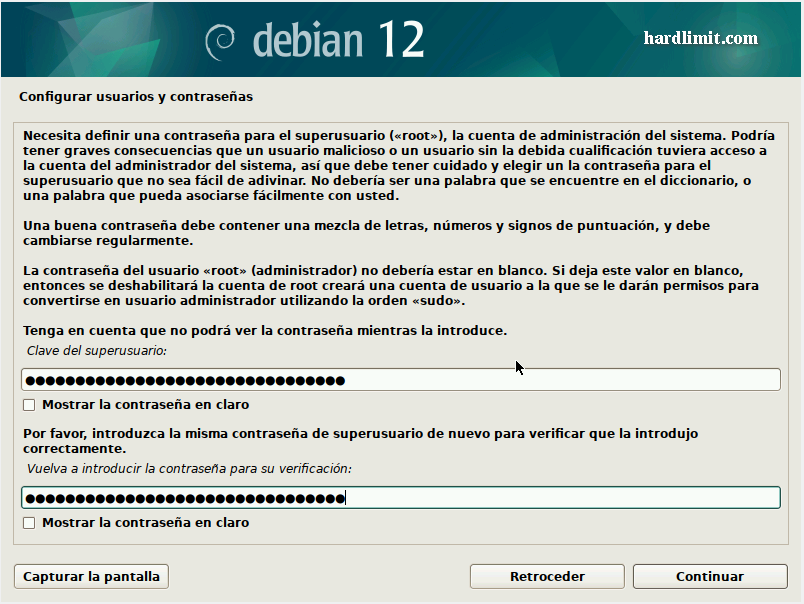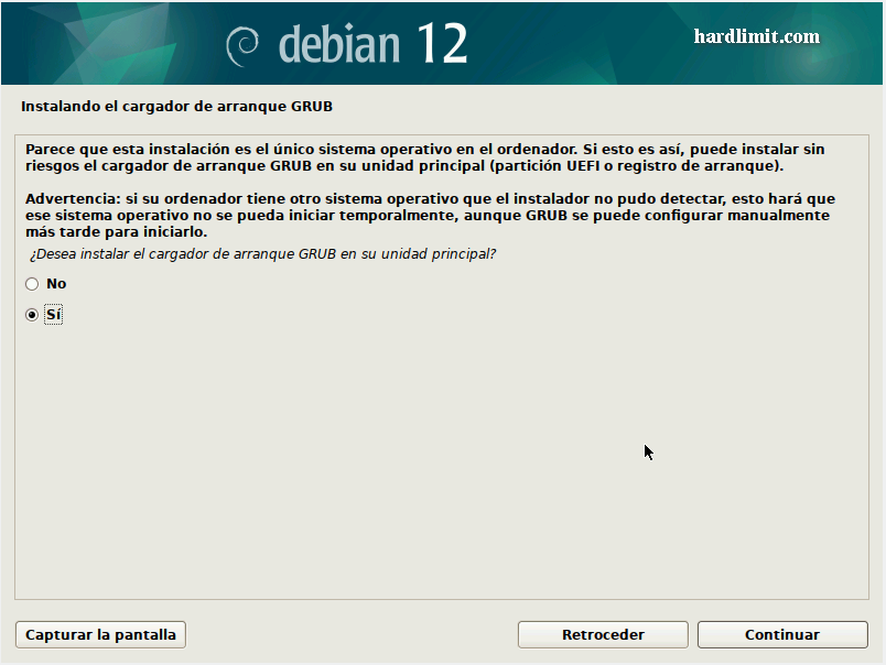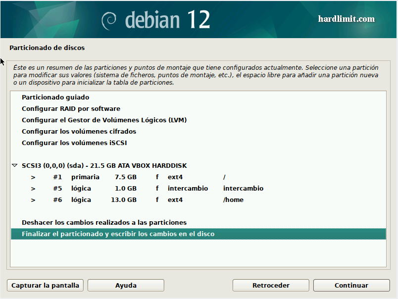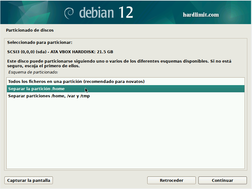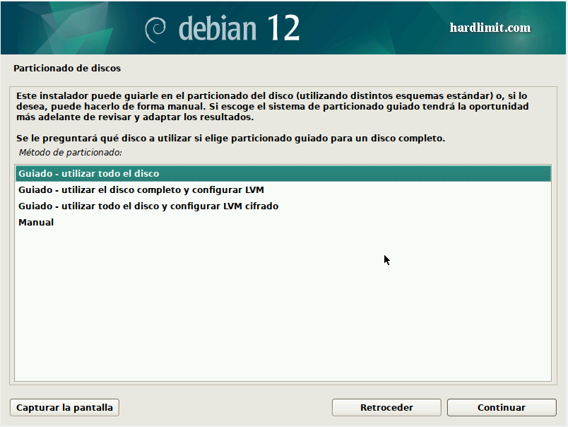 Este hilo forma parte de la guía para montar un servidor en Debian. Recuerda que el contenido de Hardlimit está bajo licencia Creative Commons. ### Resumen Sigue los pasos habituales de instalación. Cuando llegues a la selección de componentes a instalar, marca solo "SSH server" y "Utilidades estándar de sistema". El resto de opciones las dejamos desmarcadas. ### Explicación Debian, al igual que cualquier otra distribución actual, resulta extremadamente fácil de instalar. No obstante, por tratarse de un servidor habrá que elegir un par de opciones. A día de hoy resulta cada vez más difícil encontrar máquinas con unidades ópticas y en el caso concreto de un servidor, por cuestiones de eficiencia energética ni siquiera es recomendable instalar una, por lo que el proceso para realizar la instalación se podría querer hacer desde una unidad de memoria USB. Para arrancar la imagen de disco desde una unidad USB, desde Linux puedes usar esta orden como root: ```bash cat debian.iso > /dev/sdX sync ``` Donde X es el dispositivo USB al que se copiará la imagen. ¡Atención! Todo el contenido del dispositivo será eliminado. Asegúrate de que lo elijas correctamente. Para ver los dispositivos de almacenamiento conectados y sus rutas, escribe en consola esto como root: ```bash fdisk -l | grep Disk ``` Una vez que tenemos la imagen en cualquier medio, lo arrancamos y elegimos la opción "Graphical Install". Tras unos segundos nos aparece la selección del idioma. Elegimos "Spanish – Español" Cuando hacemos clic en "Continue", el idioma del instalador cambia y nos pregunta por el país. Elegimos el nuestro y le damos a continuar. En la siguiente pantalla nos preguntará por la distribución del teclado. Una vez terminada la configuración local, comienzan las preguntas de carácter técnico. La primera es el nombre de la máquina. En principio este nombre es irrelevante y se puede cambiar con posterioridad aunque sería conveniente elegir uno distintivo. Ahora llega el momento de elegir la clave de root. Es fundamental que esta contraseña sea muy robusta porque nuestro servidor va a estar expuesto a Internet y las contraseñas débiles son vulnerables a los ataques de fuerza bruta. Para terminar con la configuración de las credenciales, introducimos nuestro nombre y una contraseña para nuestro usuario. Una vez más, una contraseña robusta resulta de vital importancia. Elegimos la zona horaria y llega el particionado del disco. Esta opción depende de cada caso, pero si vamos a montar un servidor lo habitual es usar todo el disco duro para dicho servidor, sin otros sistemas operativos instalados. Teniendo en cuenta esta premisa, el método de particionado que elegimos será "Guiado – utilizar todo el disco". Si tenemos varios discos duros instalados, deberemos elegir aquel donde queremos instalar el sistema. Para finalizar el particionado, debemos elegir el esquema de particiones. En nuestro caso vamos a separar la partición raíz de la /home, aunque la opción de separar /var y /tmp junto a /home no es una mala idea. Si se producen fallos lógicos en el sistema de archivos (por ejemplo en un apagón o porque el PC se quede colgado cuando había transacciones en curso), el sistema va a intentar reparar los errores automáticamente durante el arranque. Desafortunadamente, los sistemas de archivos Ext no permiten su comprobación cuando están montados y para poder ejecutar la herramienta de comprobación (fsck), es necesario montar y mantener montada la partición donde se encuentra el programa. Eso quiere decir que el analizador del sistemas de archivos solo va a comprobar las particiones que estén desmontadas y esas son todas menos la que tiene fsck. Si mantenemos /var y /tmp en la partición raíz, no se solucionarán posibles fallos lógicos. Téngase en cuenta en por defecto, las bases de datos de MySQL (MariaDB) y Redis almacenan su información en /var y un fallo en la partición puede provocar pérdidas de datos sin que lo sepamos. Una vez introducidas todas las opciones, aparece un cuadro-resumen con los cambios que se realizarán en el disco. Si por cualquier razón, has particionado el disco de otra forma, es recomendable que revises los cambios previstos para no llevarte sorpresas desagradables. Sobre la partición de intercambio (Swap) en sistemas de escritorio se recomienda que tenga el mismo tamaño que la RAM porque es donde se almacena el estado del sistema cuando se hiberna el equipo. De esa forma, es necesario que quepa todo el contenido de la RAM. En un servidor, la hibernación no se va a usar pero la partición de intercambio puede resultar muy útil para optimizar el uso de la RAM. Linux tiene una política de gestión de memoria con la que cuando una porción de datos almacenados en RAM lleva mucho tiempo sin usarse, estos se almacenan en la Swap y deja esa porción de RAM libre. En un servidor puede llegar a ser interesante sacarle provecho a esta funcionalidad para optimizar los recursos al máximo. Además, en caso de que nos quedemos sin RAM de forma puntual, nos puede sacar de un apuro que podría requerir reiniciar el sistema. El tamaño depende en gran medida de qué tipo de servicios se vayan a instalar, pero si ves que te va a sobrar disco, sé todo lo generoso que puedas. En mi caso, tengo una partición de intercambio de 96GB en un sistema con 32GB de RAM y en alguna ocasión (casos muy especiales, pero que se han presentado) me ha salvado hasta el último byte de dicha partición. Una vez confirmado, comienza la instalación del sistema base que son los componentes esenciales para que el sistema funcione. Sobre ese sistema base se instalarán los servicios que vamos a necesitar. Después de unos minutos llega el turno de elegir nuestro país una vez más. De esta elección dependerá el espejo desde donde se descargarán los paquetes para instalar el resto del sistema y las actualizaciones futuras. Cualquiera de los espejos nos valdrá. Si 
