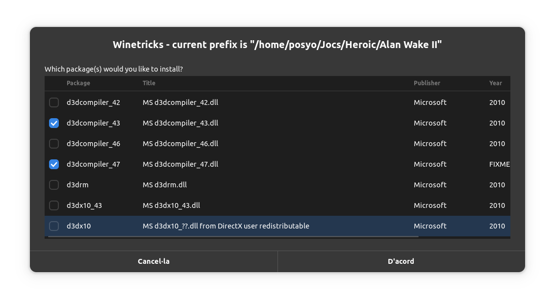 • Le damos y saldrá un menú, seleccionamos «Select the default wineprefix», después seleccionamos «Install a Windows DLL or component» y ahí aparecerán una gran cantidad de dlls para instalar. Seleccionamos «d3dcompiler_43», «d3dcompiler_47» y «vcrun2022».
