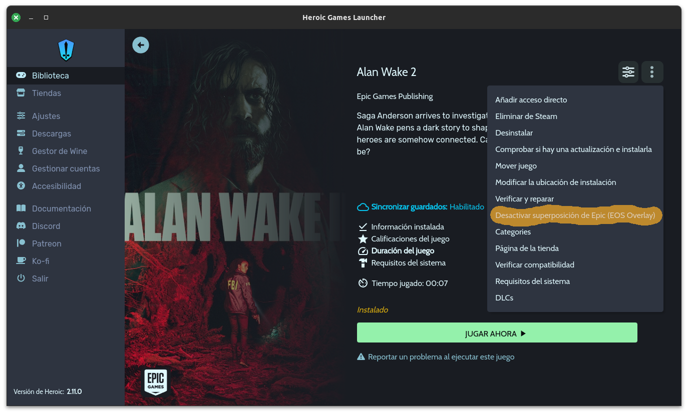 • Es importante que, desde Heroic, activar la superposición de Epic (EOS Overlay) para que funcione y además que así se actualizan los logros, podéis acceder a la consola de Epic, ver a vuestros contactos, etc...