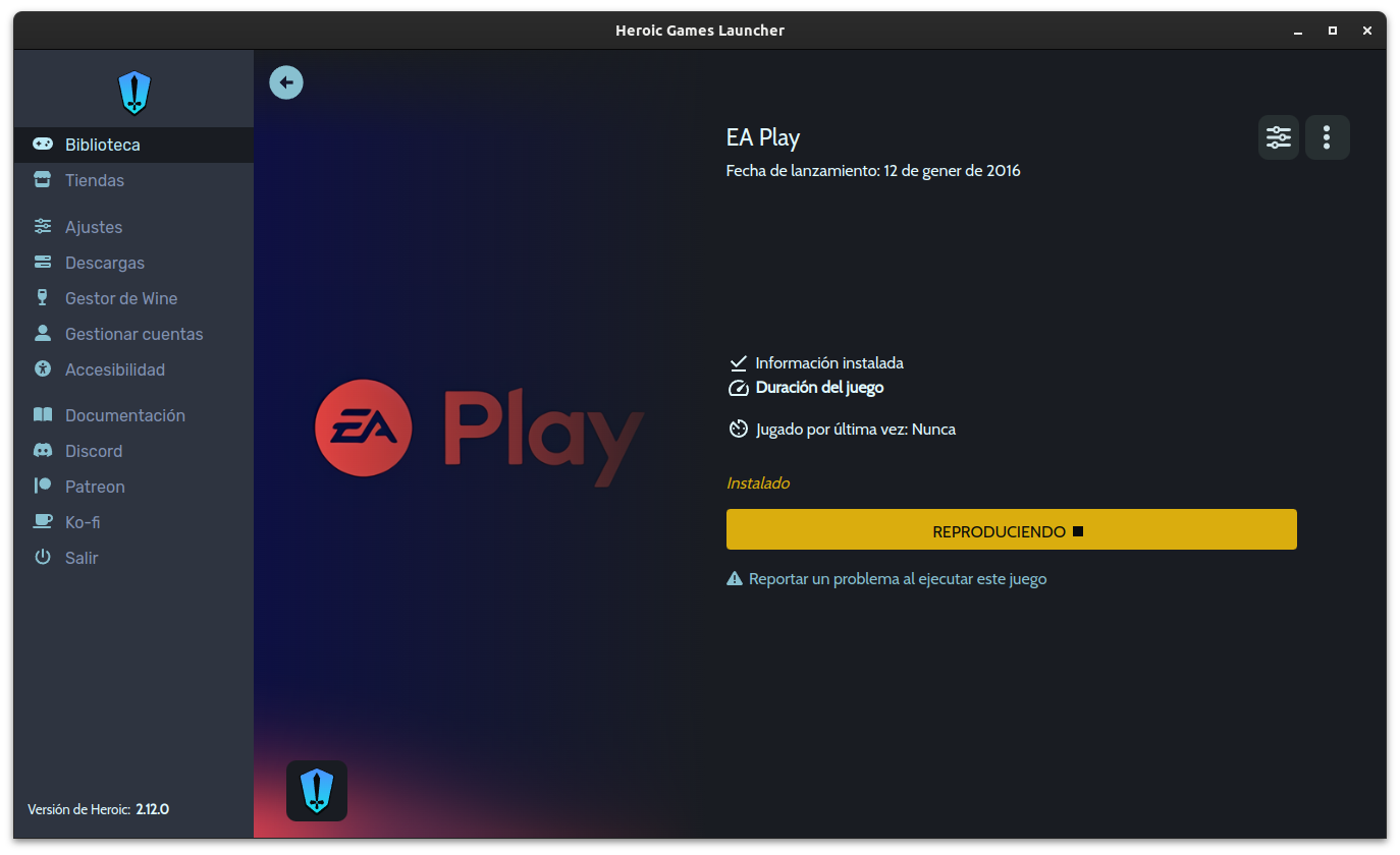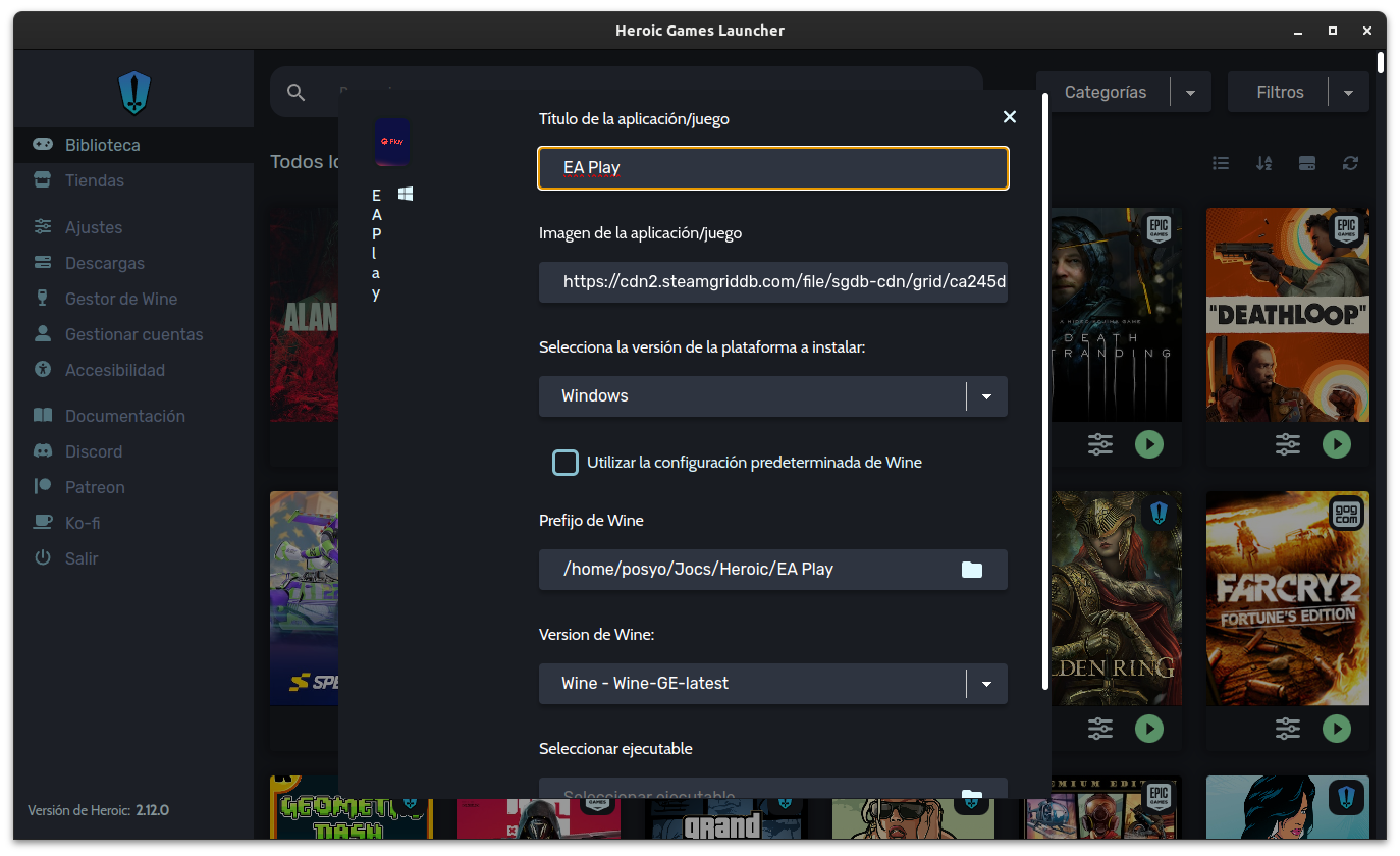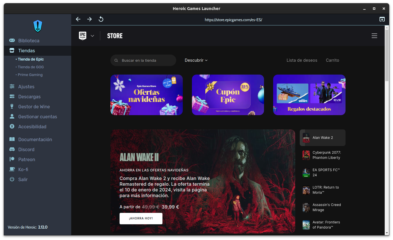• Heroic Games Launcher: Es un launcher Open Source preparado para disponer de nuestro catálogo de Epic, GOG y Amazon Prime. No obstante, también podemos configurar aplicaciones de terceros y con ello instalar otros launchers oficiales. Una vez instalamos el launcher, configuramos las cuentas (en la columna de la izquierda están las diferentes opciones entre ellas la gestión de cuentas, ajustes, gestor de wine, etc...). Una vez configuradas las cuentas, en Biblioteca tendremos todo el catálogo de juegos de estas tiendas que tengamos en propiedad y en Tiendas podemos acceder al catálogo para adquirir nuevos juegos.