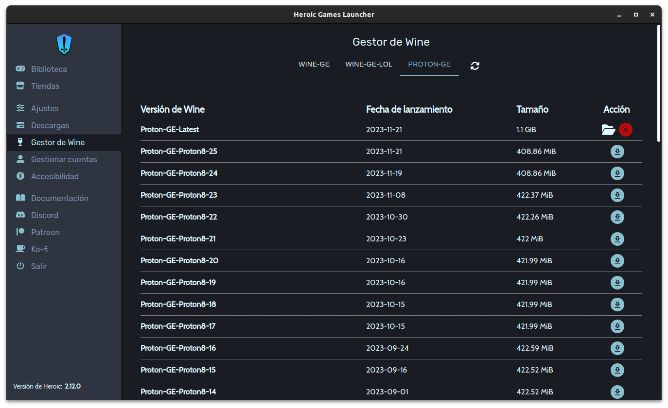 En Gestor de Wine podemos instalar las útlimas versiones de WineGE y ProtonGE. Lo recomendable es tener la última versión de ambos porque hay juegos que van mejor con uno y otros que van mejor con otros.