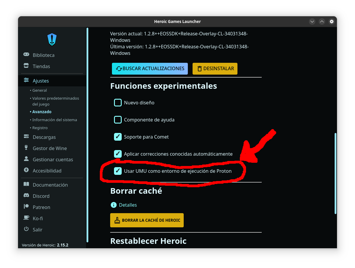 En Ajustes, aparte de la configuración típica como elegir carpetas alternativas de instalación, la versión de Wine por defecto, etc... en Avanzado hay que tener actualizado el EOS Overlay para tener sincronizado los juegos, los logros y nuestros contactos con los servidores de Epic. Algunos juegos no funcionan si ésta no está actualizada.