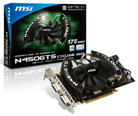 Por unos 130 euros, la GeForce GTS 450 cuenta con la GPU GF106 a 783 MHz, 192 núcleos CUDA, 1566 MHz shaders, 1 GB de memoria GDDR5 a 3608 MHz con una interfaz de 128 bit, salidas dual-DVI y HDMI, conector de alimentación PCIe de 6 pines, y soporte DirectX 11, 2-way SLI, PhysX, 3D Vision y Surround de Nvidia.